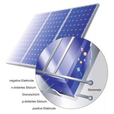 Eine Photovoltaikanlage besteht aus mehreren verbundenen Komponenten, wobei die Solarzellen das Herzstück bilden. Diese Solarzellen sind mit einer sehr dünnen Siliziumschicht überzogen, welche durch Licht und Wärme leitfähig wird. Ihre blaue Farbe kommt von der obersten „Antireflexionsschicht“, die die Reflexion von Sonnenstrahlen verhindert. In zwei weiteren Schichten wird durch Verunreinigungen der Siliziumschicht mit Phosphor oder Bor ein Überschuss an Elektronen erzielt, während im Rest der Zelle ein Mangel an Elektronen herrscht.